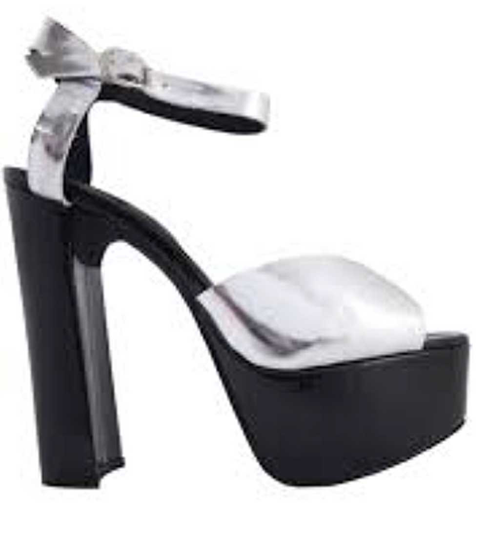 Loading... Please wait...Get sassy with Orianna by Jeffrey Campbell. This disco ready platform will have you dancing the night away. Made of a silver lame patent leather upper and covered platform, this beauty has a 5" heel and 2" front platform. Adjustable buckle, peep toe opening, and leather lining.