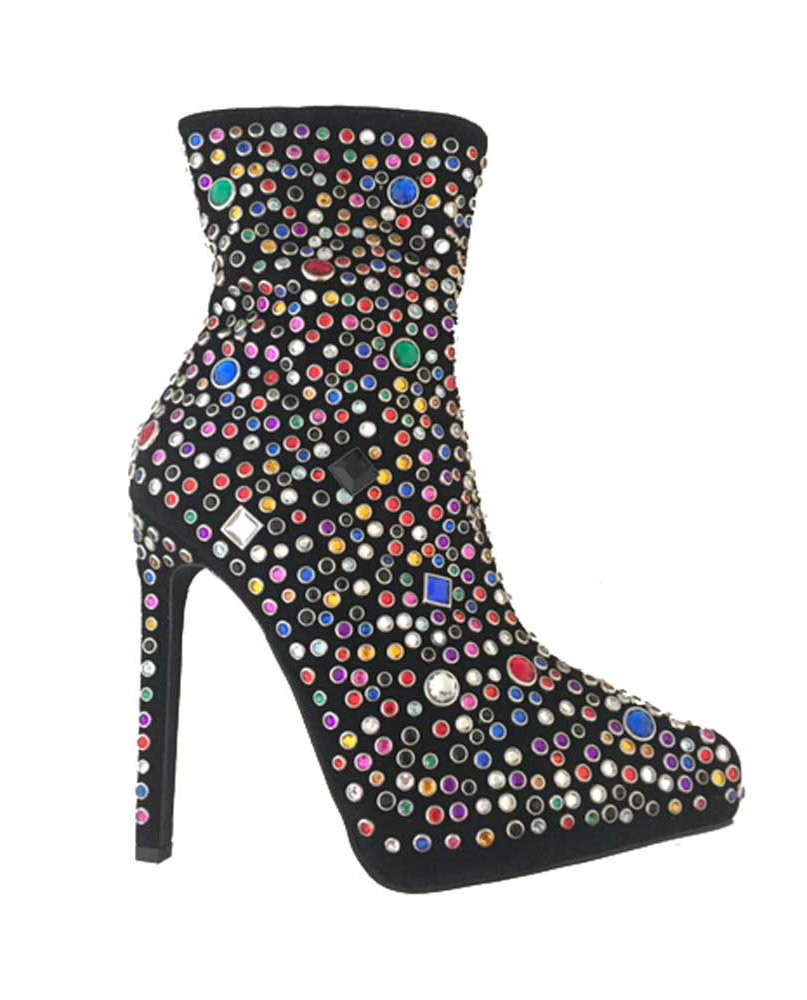Vain by Jeffrey Campbell is a bejeweled masterpiece. Perfect for the holidays, this multicolored jeweled stiletto boot will make you the life of every party. Featuring a suede upper, 5" heel, 1" platform, and silver rimmed jewels in multiple colors. Inside zipper, color Black Multi.